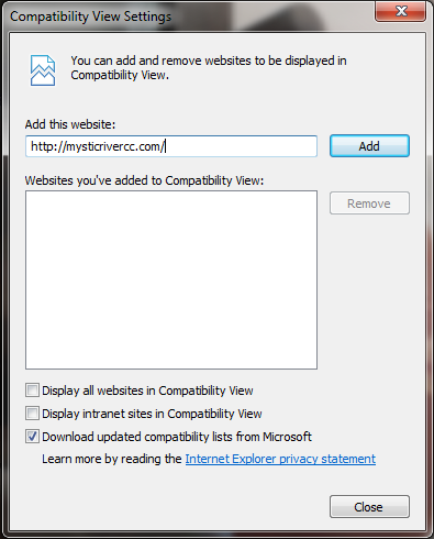 Click Add followed by Close. Your website will now load in compatabilty view.