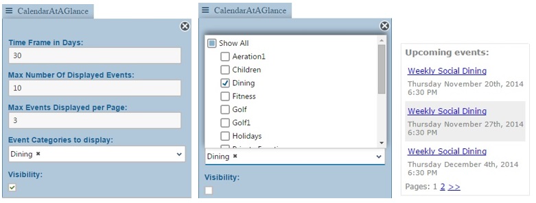The ability to display upcoming events of a particular category or list all upcoming events based on the following parameters. Time Frame in Days: This specifies the range of dates to be searched for upcoming events. Max Number of Displayed Events: Specifies the maximum number of events shown at a given time spread among multiple pages within the web part. Max Events Displayed per Page: Specifies the maximum number of events shown on a single page within the web part. Event Categories to display: select the categories that are to be displayed in this Calendar web part on this particular page. It can display anywhere from one category or display All categories in the web part. Example if this is a dining page check only the Dining Category. Visibility: Check box to turn the visibility on, uncheck to turn it off.
