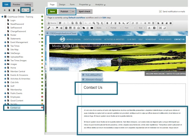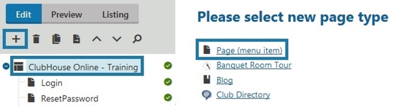 1. In the content tree click on the Root Page - ClubHouse Online – Training (This will display the name of the club) 2. Click on the NEW (+) button 3. On the Please select new page type screen, click on Page (menu item)
