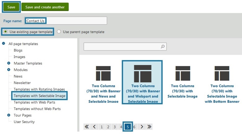 This screen allows you to choose your page’s layout (i.e. a page with 1 column vs a page with 2 columns vs a page that displays upcoming events and/or weather). 6. In left hand pane select: Templates with Selectable Image (these templates allow the default banner image to be changed on a page by page basis if so desired) 7. In right hand pane select your desired Page Layout: