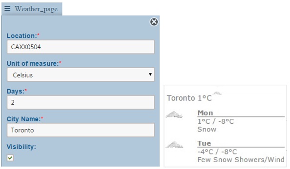 Unit of Measure: Fahrenheit or Celsius Days: Specifies number of upcoming days to display. Note: 2 days is the maximum. City Name: Specifies the displayed city or club name on the page. Note: 20 character limit. Visibility: Check box to turn the visibility on, uncheck to turn it off.