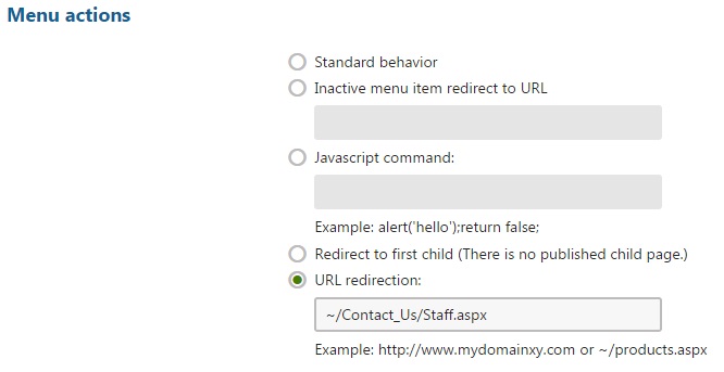 Inactive Menu Item redirect to URL: The menu item click doesn't raise any action - the item is disabled. This option is useful if you need to create a menu item for the main section in the drop-down menu that cannot be clicked, but the sub-items can be clicked.