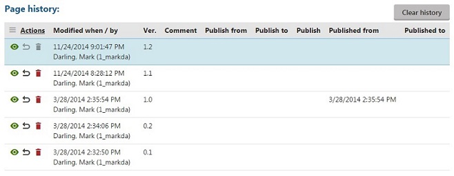 Within this tab, you will be able to view previously saved and/or published versions of the selected page. The ‘Actions’ options allow you to ‘Preview’ (and compare) older versions of the page and “Roll Back” (publish) to earlier versions, as well as delete any older version.