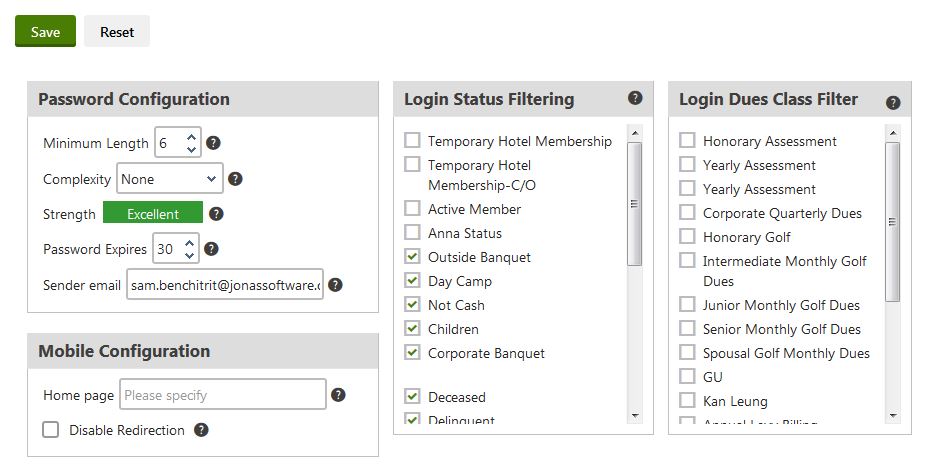The Login Configuration section of Company Management allows Administrators to determine which members cannot log in to your ClubHouse Online E3 website based on their member status. Administrators will also have the ability to set password guidelines and requirements for their members. These include: