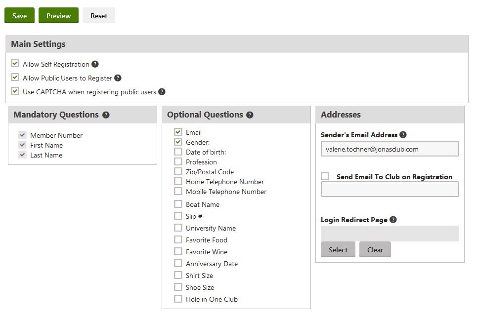This section allows you to turn on member self-registration and determine which questions are asked of members as part of self-registration. Once the member has been validated they can immediately create a user account in ClubHouse Online.