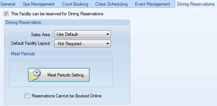 Reservations cannot be Booked Online – This setting allows a facility to be used for online reservations but prevents reservations from being booked online by hiding the facility from the Dining Search.