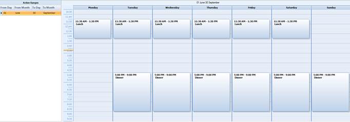 The Meal Period Settings dictate what days and times a specific Meal Period are available. The Active Date Ranges are based on a day/month schedule and remain constant regardless of the year. This allows the availability to be setup for specific days and/or weeks at a time.