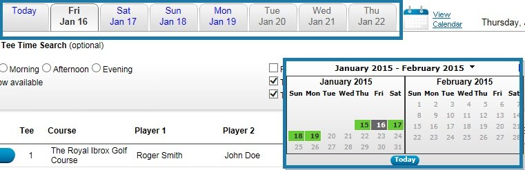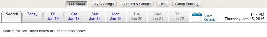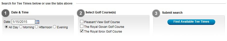 From Tee Sheet, users have the option to search for open times by submitting a date, time range, and golf course. The system will then return the results of the search.