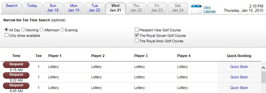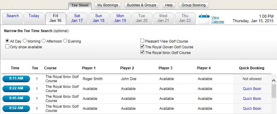 Once the system has returned the search results, users can select and book an open tee time via the blue pill button located on the left side of the table, or by using the Quick Book feature located on the right side of the table.