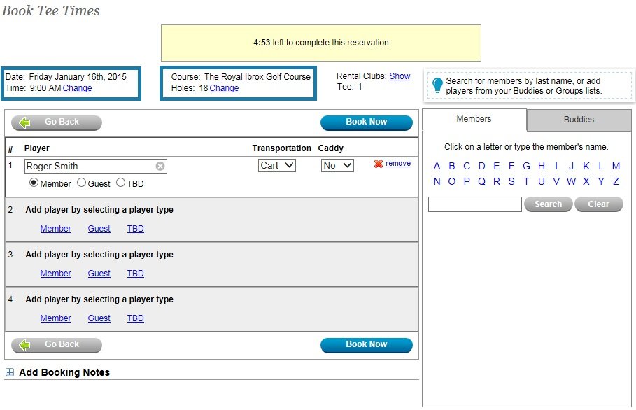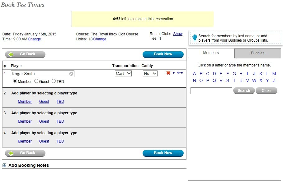 Users will click Book Now to complete the request booking. A pop-up confirmation window will appear with the details of the booking. Each player does not receive an email in this instance; if the club is using J-mail players will receive an email confirmation of their tee time once the Lottery is ran and their request has been processed.